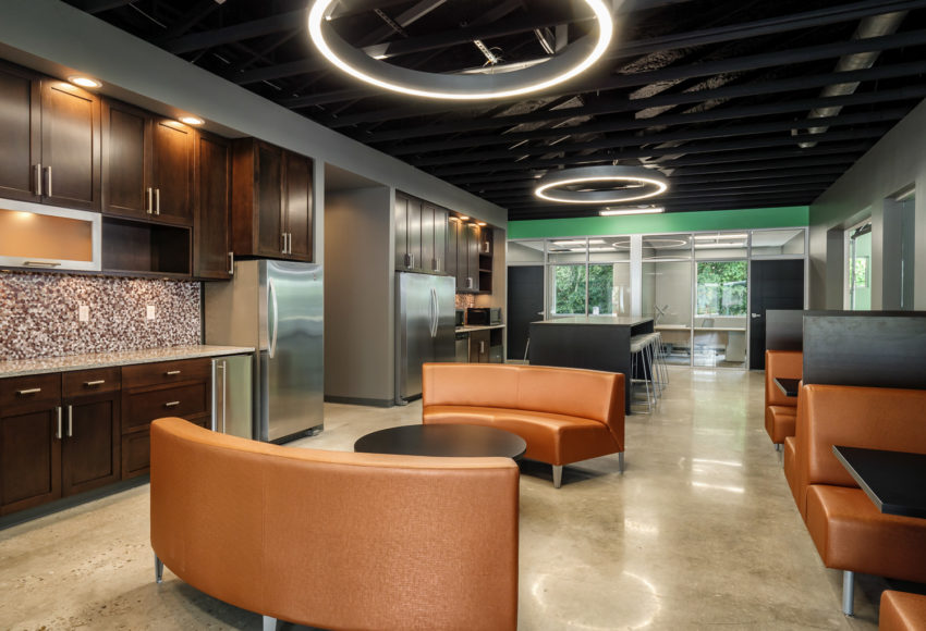 Finely appointed throughout, this corporate office renovation was constructed to be a home away from home for employees and visitors alike.