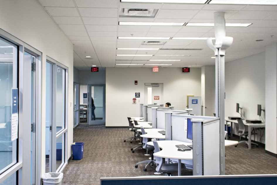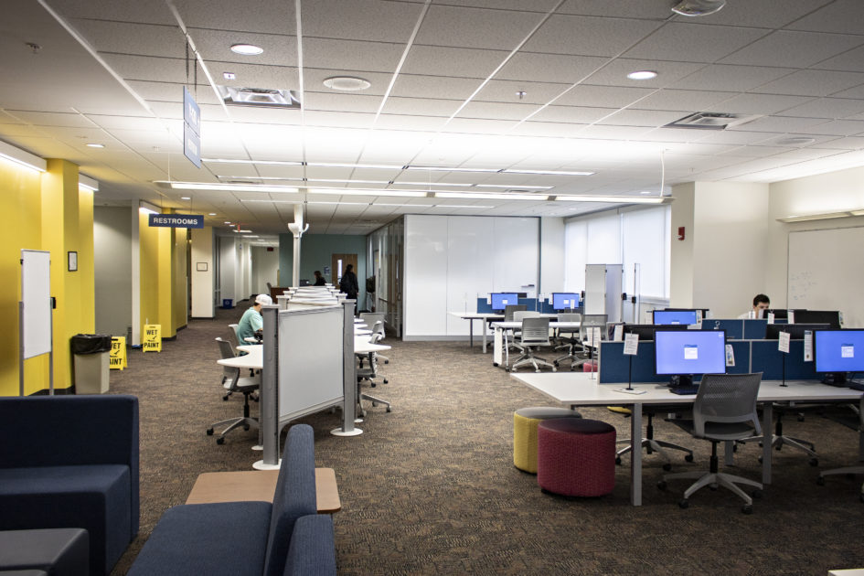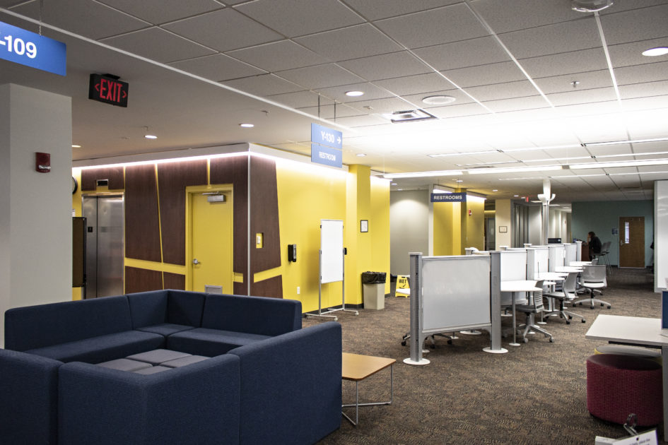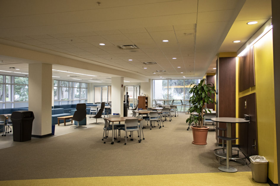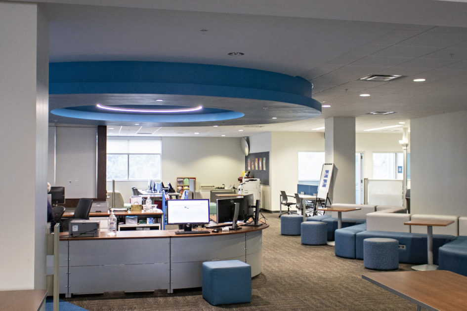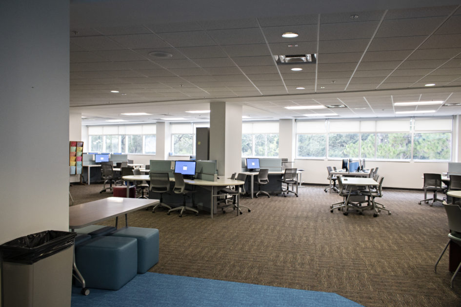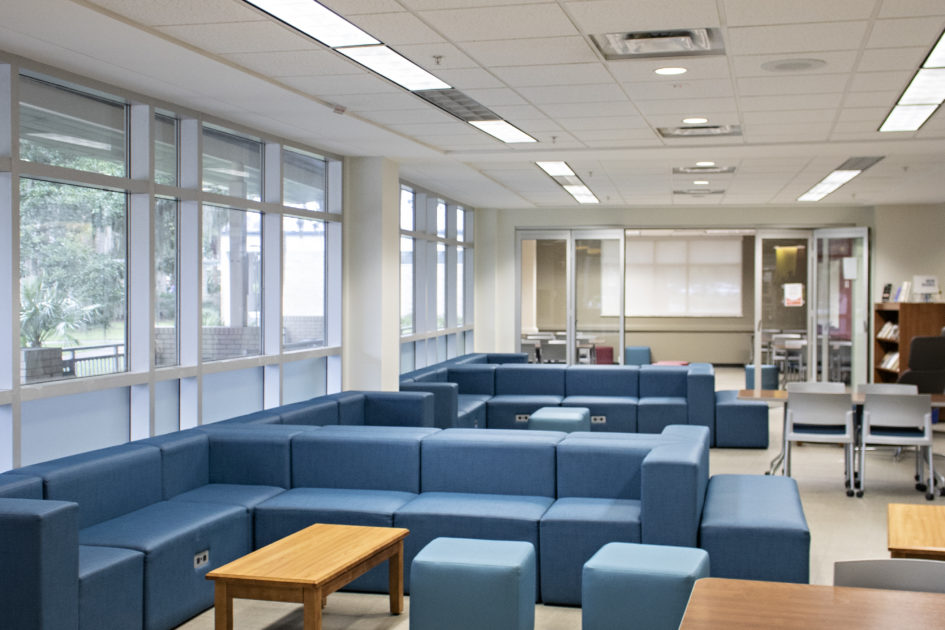 The Santa Fe College Library, located on the Northwest Gainesville campus, underwent a major renovation and remodel of the first and second floors. The goal was to incorporate a new Learning Commons into the existing Library. The Learning Commons is a collection of learning spaces that will elevate the existing Library into the 21st Century with interactive spaces for information technology, remote or online education, tutoring, collaboration, content creation, meetings, socialization, and group study. This new space better serves the students, faculty and the growing technological and facility needs.