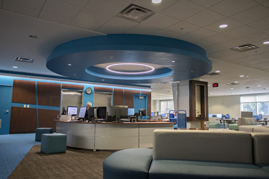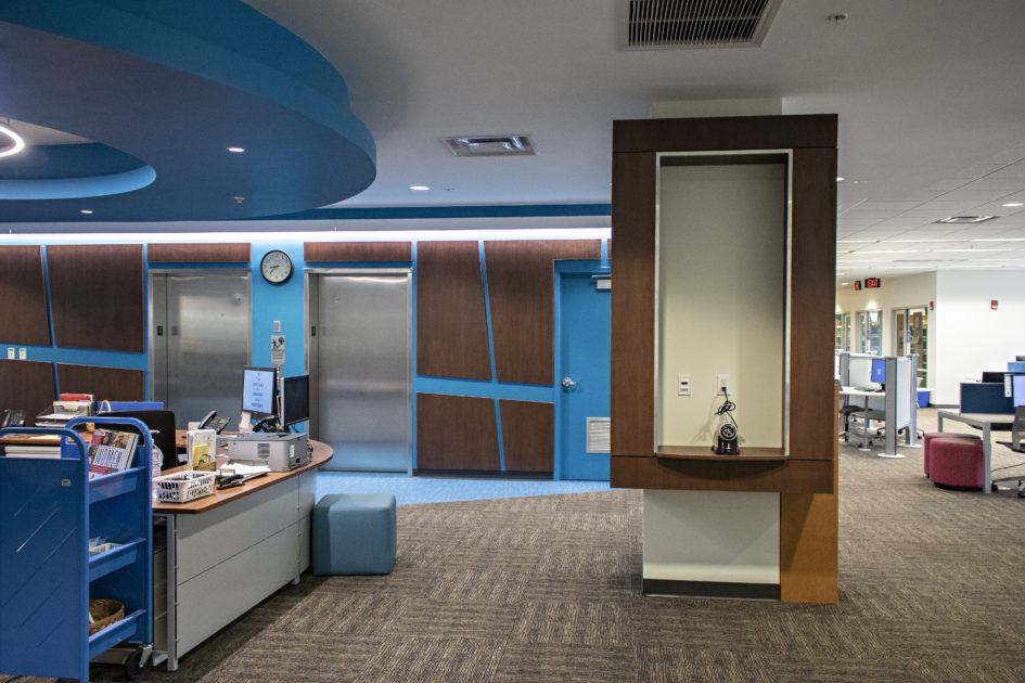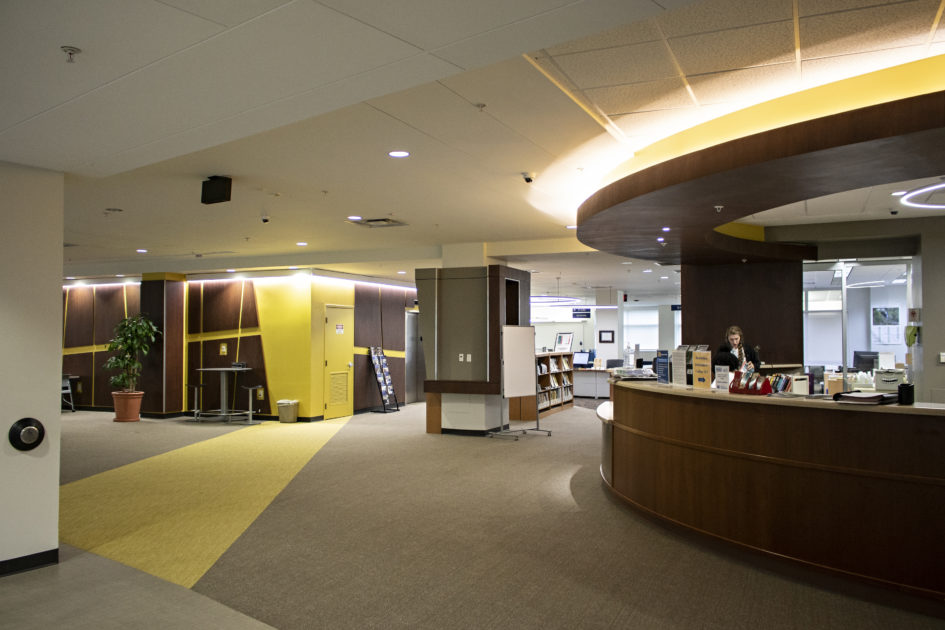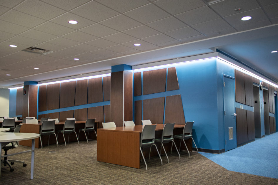 The three-phase renovation included demolition of existing offices, new framing, drywall and paint throughout, new storefront systems, a folding glass wall partition, new doors and hardware, acoustical ceiling modifications, new flooring and other decorative design elements to modernize the space. Upgrades to the mechanical, electrical and fire protection systems also took place.