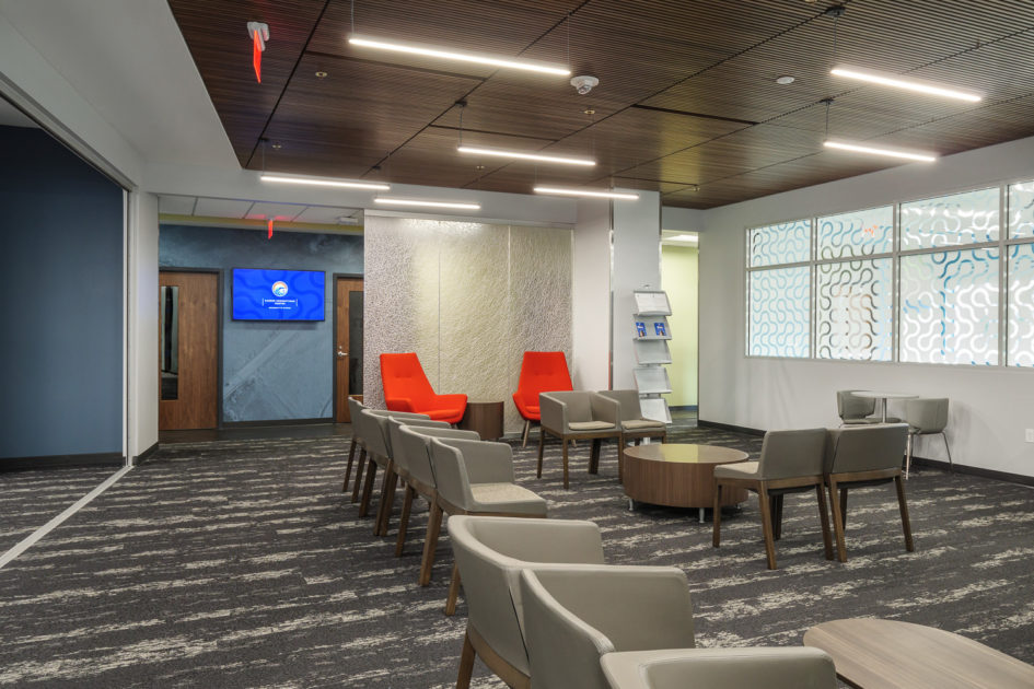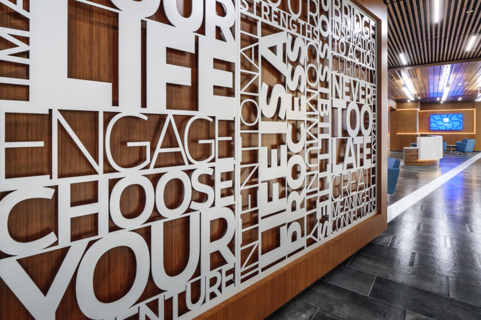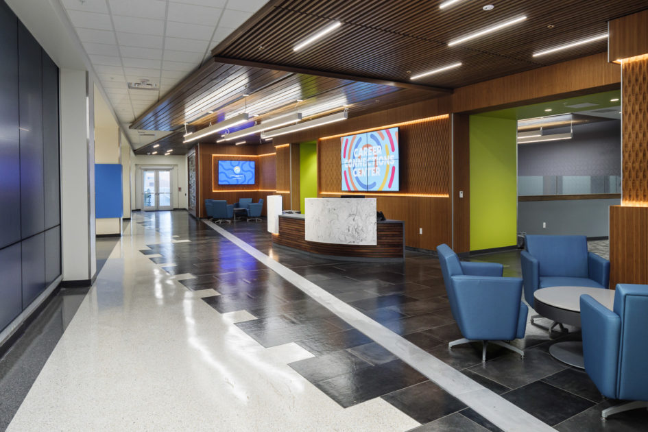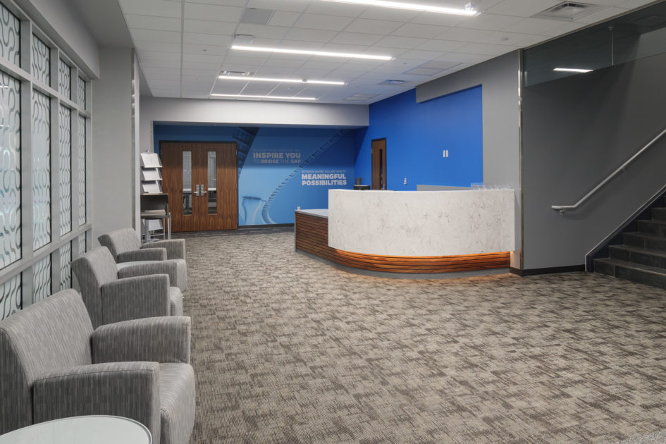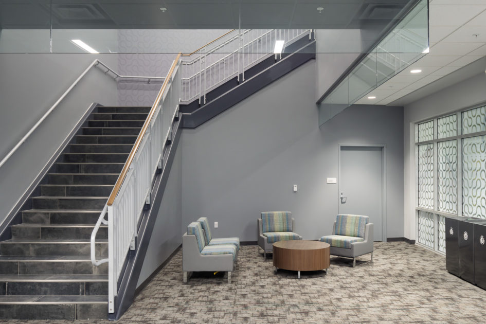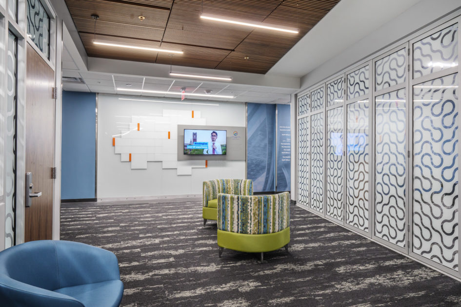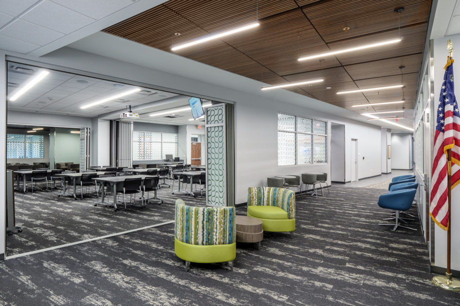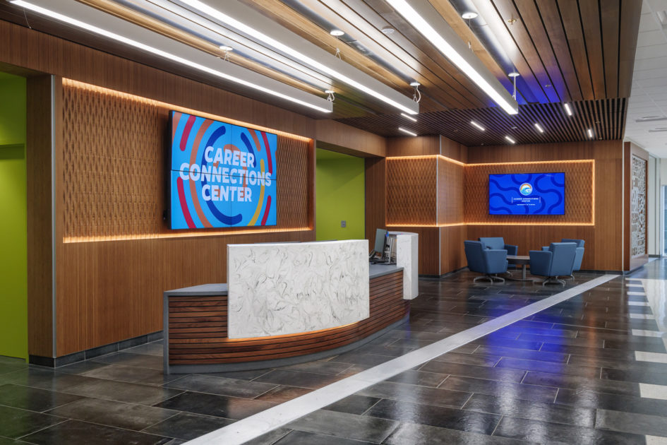 This expansion and renovation project features a new library, conference and seminar spaces, interview rooms, lounge areas, and offices for staff and student assistants. The facility was outdated in its utility infrastructure and technology capabilities. This renovation upgraded all systems utilities and provided advanced technologies for the library and video conferencing. New spaces include collaboration areas as well as acoustically controlled spaces for private conversations and interviews. The resulting project transformed an outdated area to modern spaces with technologies needed for today’s students in a more comfortable, professional and inviting atmosphere. This project included site improvements, underground utilities, total building commissioning, all new furnishings and equipment, and a fantastic graphics package further enlivening the space.